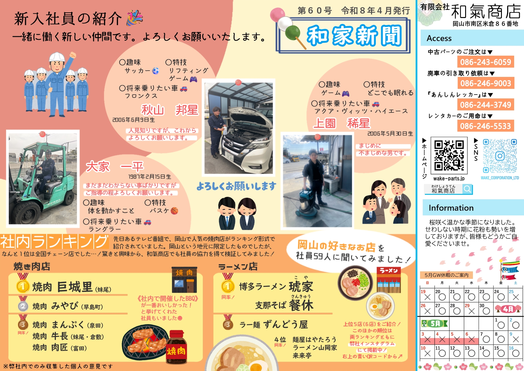 2026.04.20 和家新聞ブログ 和家新聞 R8年-4月号をアップしました。 いつも和氣商店をご愛顧いただき、誠にありがとうございます。 和氣商店の最新情報をお届けする 和家新聞 の更新、今回は4月号です。 ※画像をクリックして拡大